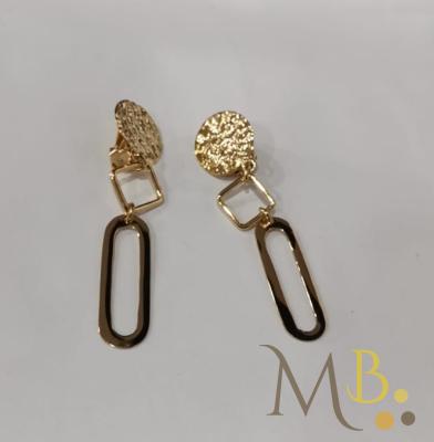 ARETES DE CIRCULO MARTILLADO CON ROMBO Y RECTANGULO COLGANDO CON CLIP CON BAÑO DE ORO DE 3 CAPAS
